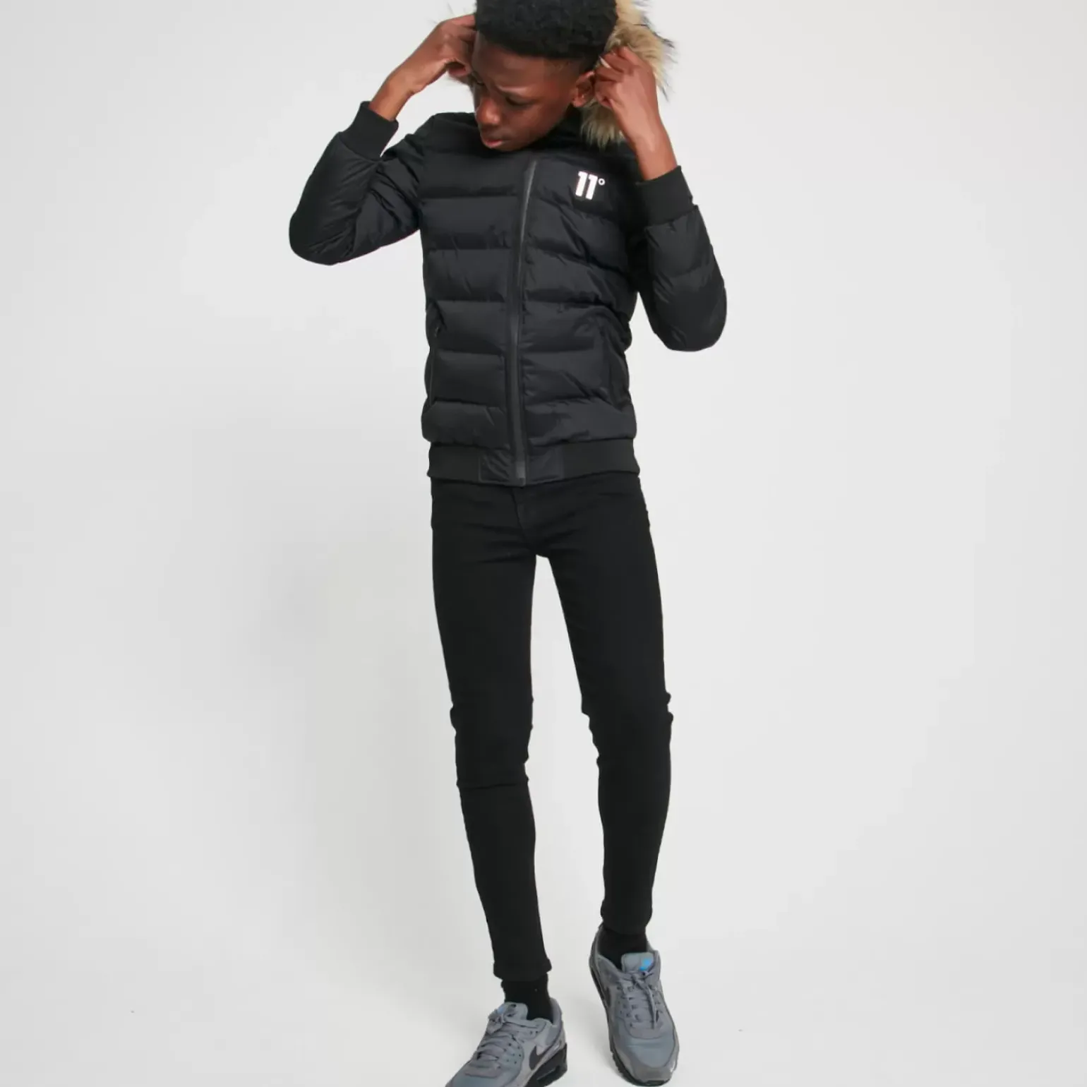 - Keep The Elements At Bay By Wearing The Modern 11 Degrees Junior Missile Jacket – Black. The Jacket Is Designed In A Bomber, Padded Style For Warmth And Comfort, It Also Has A Fixed Faux Fur Hood. The Iconic 11 Degrees Logo Is Displayed On The Left Side Of The Chest.
