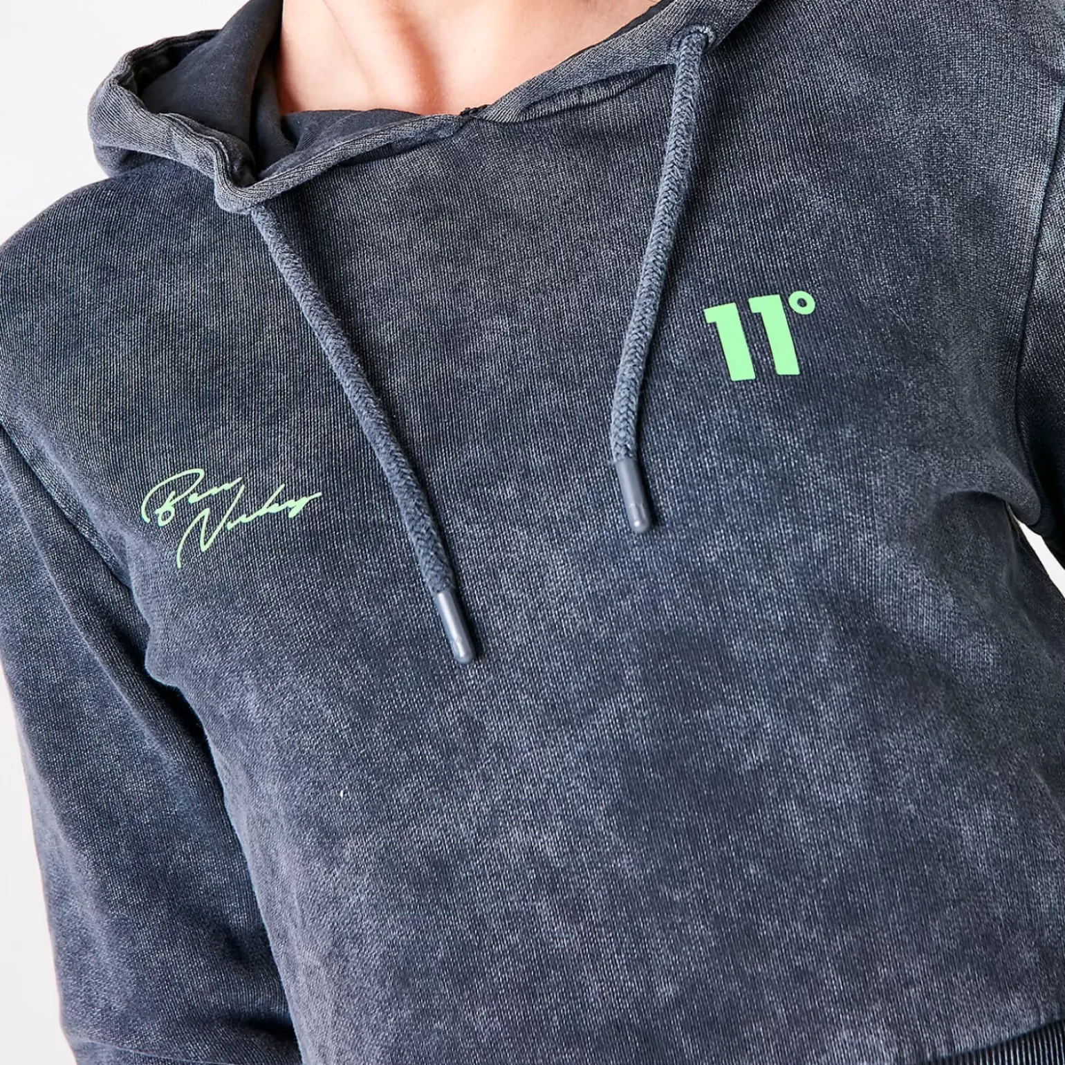 11 Degrees Womens Ben Nicky Acid Wash Cropped Hoodie – Black Acid Wash / Lime Green