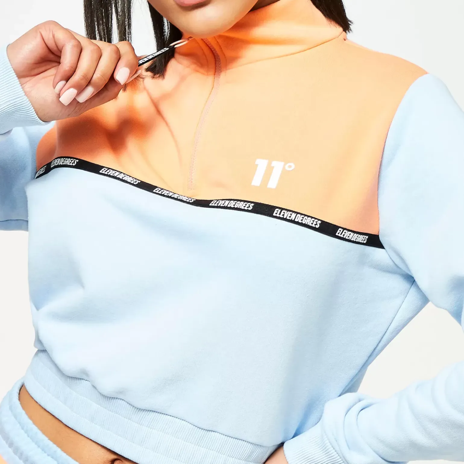 11 Degrees Womens Taped Colour Block Cropped Quarter-Zip Sweatshirt – Baby Blue / Coral