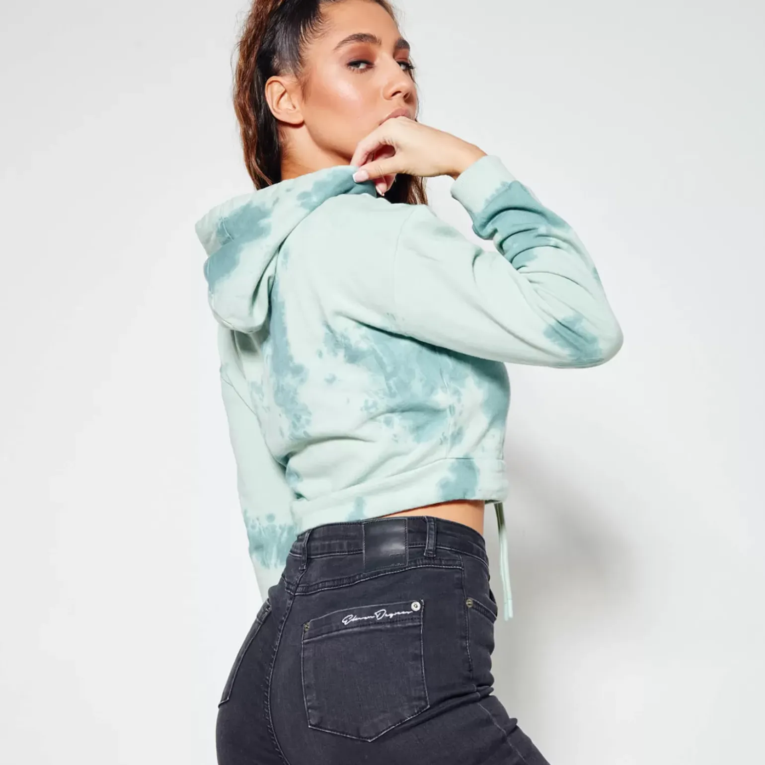 11 Degrees Womens Tie Dye Cropped Pullover Hoodie – Teal Blue / Fog Green